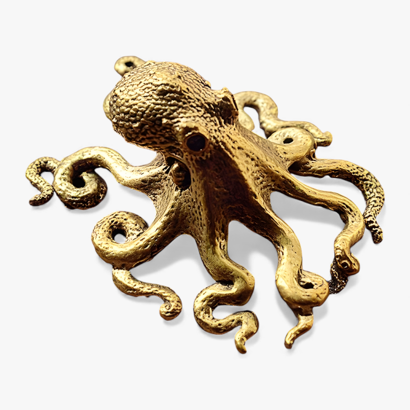 Denne kompakte blækspruttefigur i solidt kobber tilfører et strejf af mystik og karakter til hjemmet. Den organiske form med de mange buede arme giver et dynamisk udtryk, som både er dekorativt og iøjnefaldende. Den antikke overfladestruktur skaber et smukt spil i lyset, der fremhæver figurens fine detaljer. Skulpturen passer perfekt som accent på hylder, skrivebord eller sofabord og giver indretningen et raffineret præg.