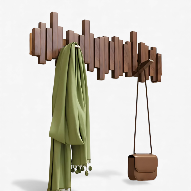 Denne knagerække kombinerer naturens organiske udtryk med praktisk hverdagsfunktion. De forskudte træstave skaber en levende, bølget struktur, der tilfører rummet varme og visuel dybde. Knagerne kan foldes ind, når de ikke er i brug, så væggen beholder et roligt og minimalistisk look. Træflux passer perfekt i entréen, soveværelset eller kontoret og gør det nemt at holde styr på overtøj og accessories uden at gå på kompromis med æstetikken.